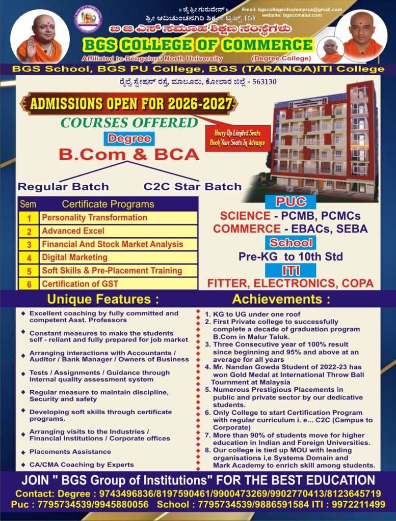 The campus of BGS College of Commerce Malur boasts modern infrastructure, lush greenery, and vibrant student life. It provides a conducive environment for learning and personal development, with well-equipped classrooms, libraries, sports facilities, and spaces for extracurricular activities.